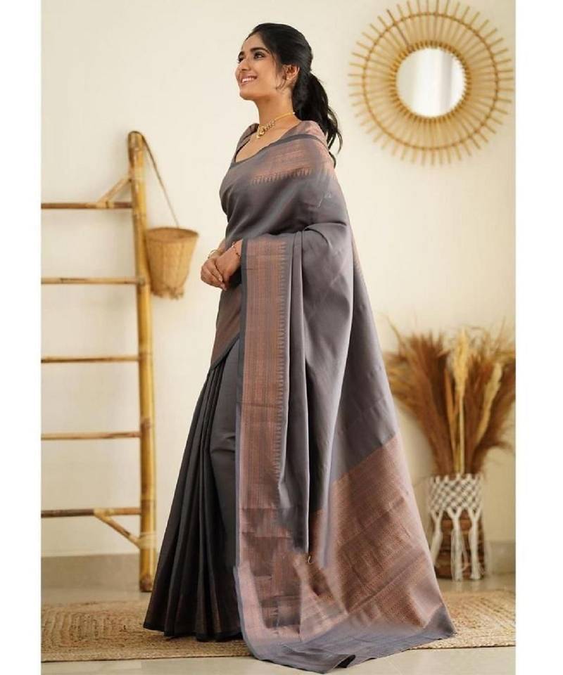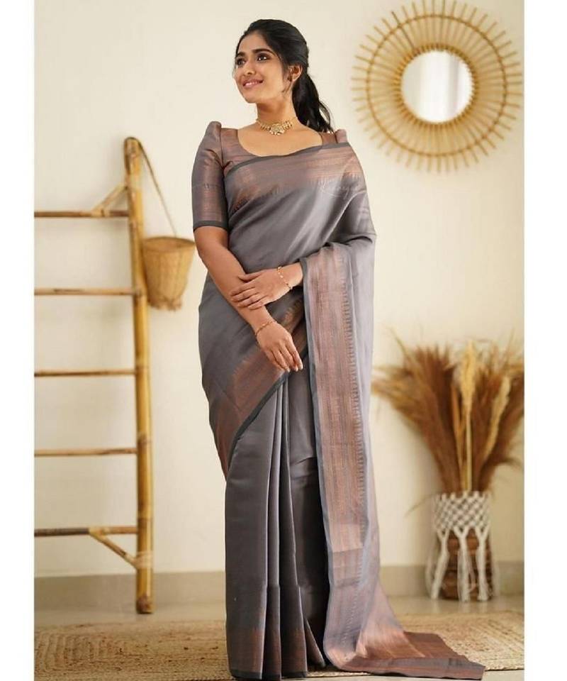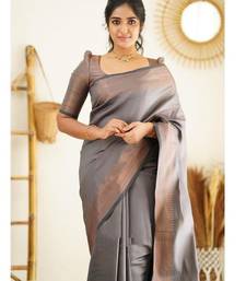Grey soft silk blend banarasi jacuard work designer party wear saree with unstitched blouse piece