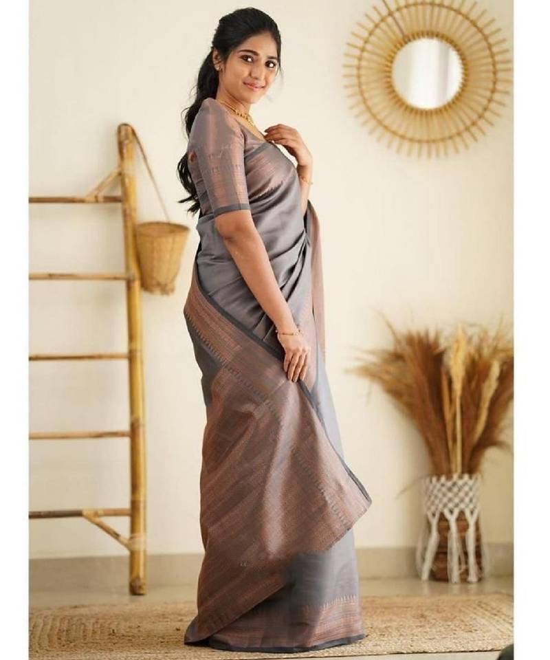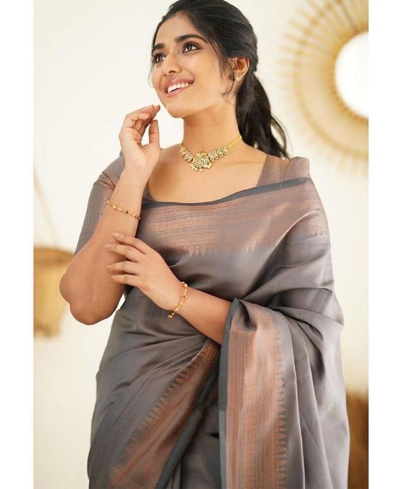| Product Name | Grey Soft Silk Blend Banarasi Jacuard Work Designer Party Wear Saree With Unstitched Blouse Piece | |
