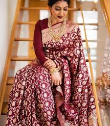 Maroon soft silk blend banarasi jacuard work designer party wear saree with unstitched blouse piece