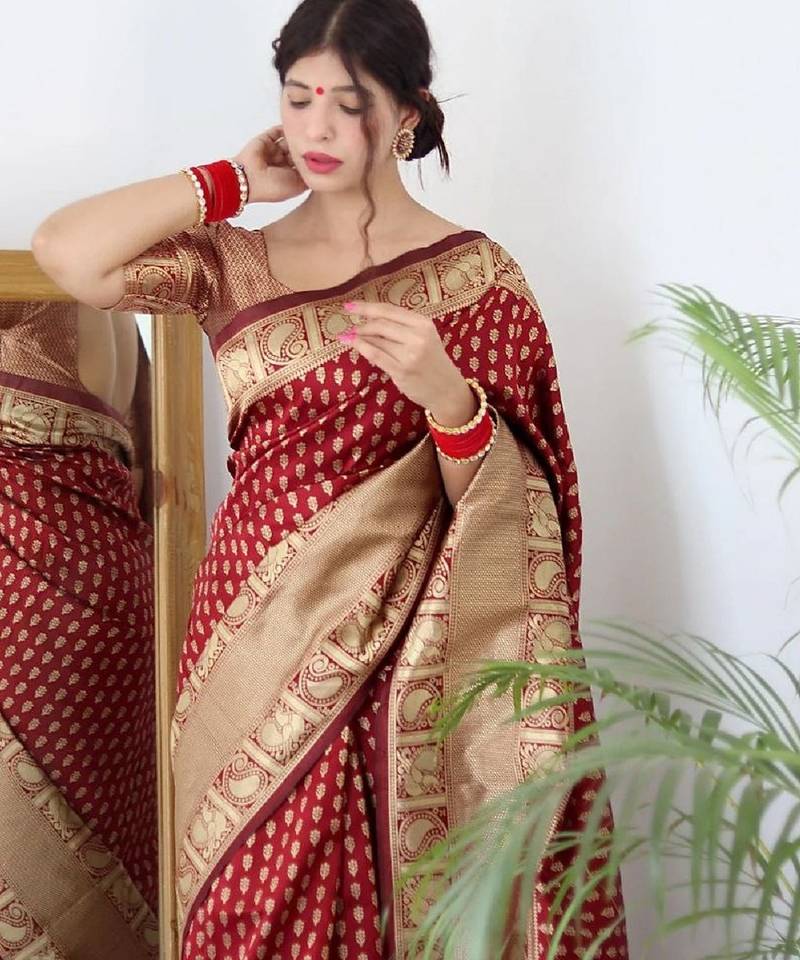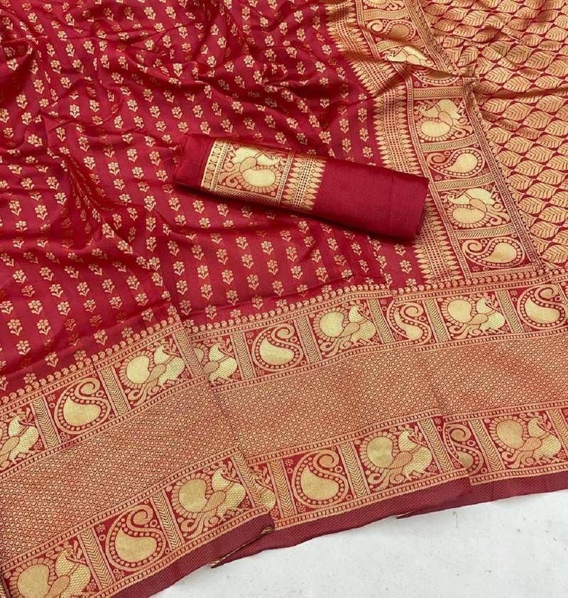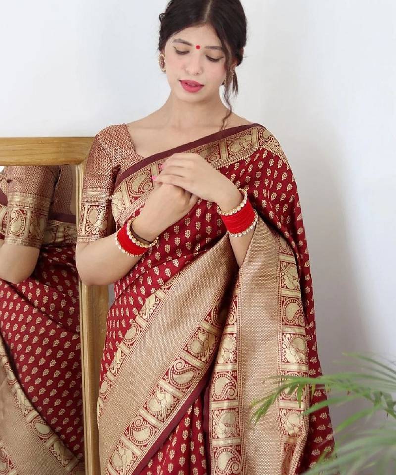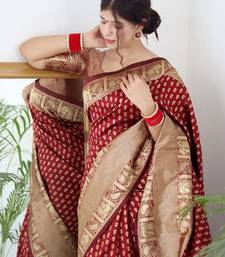 Maroon soft silk blend banarasi jacuard work designer party wear saree with unstitched blouse piece