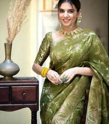 Mehendi soft silk blend banarasi jacuard work designer party wear saree with unstitched blouse piece