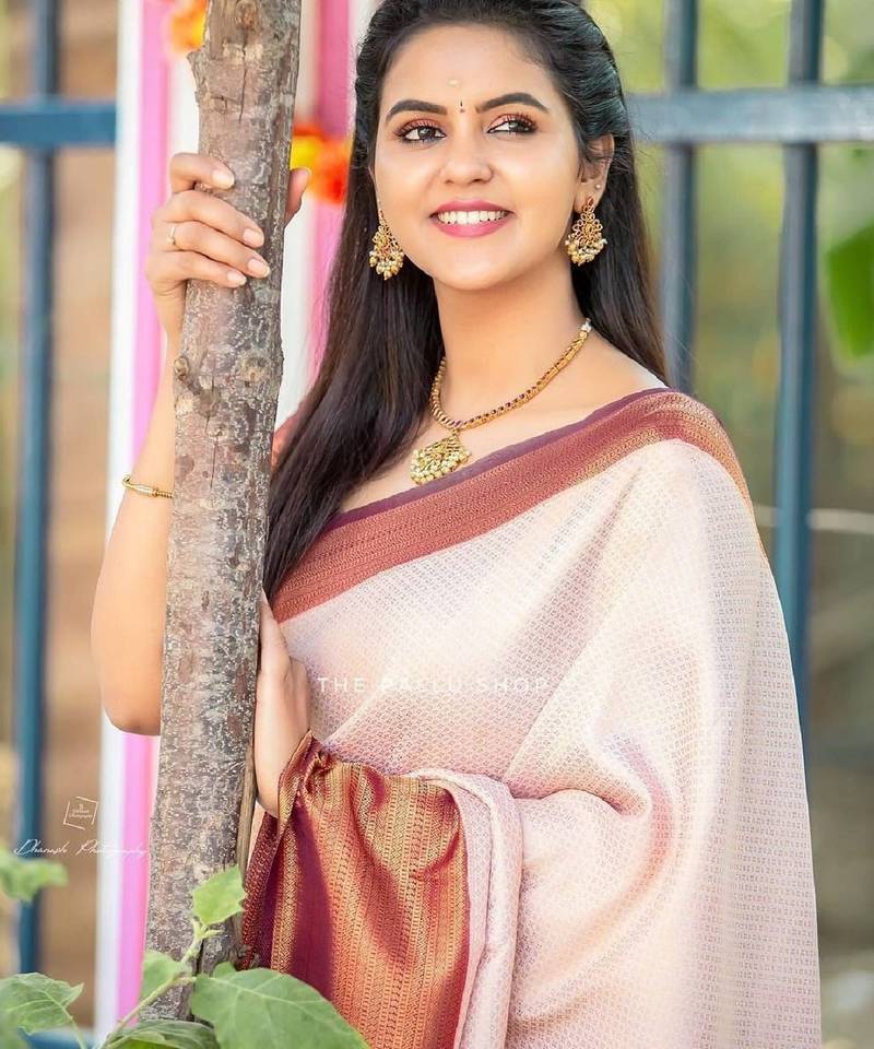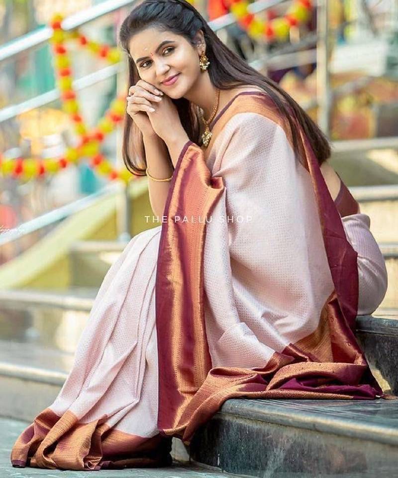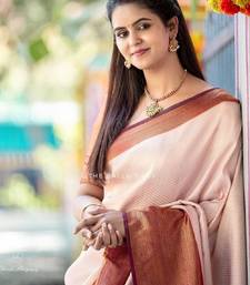 Design Details The Saree Features A Soft Peach Base Adorned With Delicate Woven Motifs That Enhance Its Royal Charm. The Rich Wine Colored Border And Pallu Are Intricately Designed With Traditional Banarasi Zari Weaving, Adding Depth, Contrast, And Grandeur To The Overall Look. The Ornate Zari Work Reflects Classic Heritage Craftsmanship, Making This Saree Ideal For Festive Occasions, Weddings, Cultural Events, And Celebrations. Blouse Details