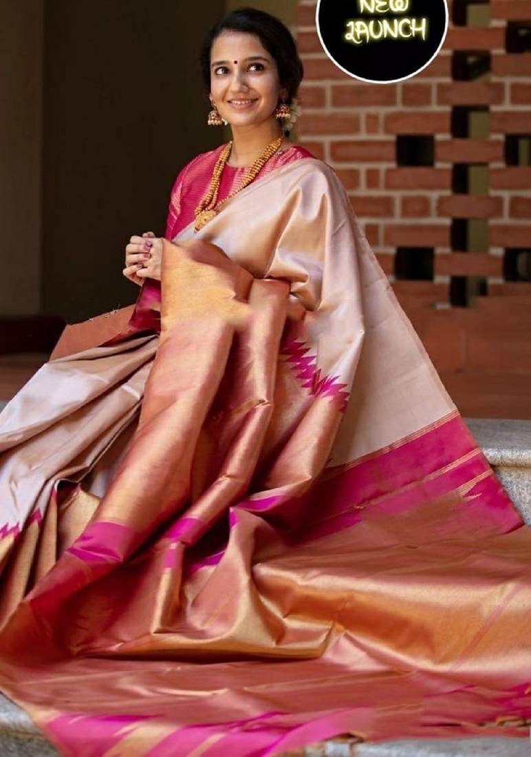 Design Details The Saree Features A Soft Peach Base Adorned With Delicate Woven Motifs That Enhance Its Royal Charm. The Rich Wine Colored Border And Pallu Are Intricately Designed With Traditional Banarasi Zari Weaving, Adding Depth, Contrast, And Grandeur To The Overall Look. The Ornate Zari Work Reflects Classic Heritage Craftsmanship, Making This Saree Ideal For Festive Occasions, Weddings, Cultural Events, And Celebrations. Blouse Details