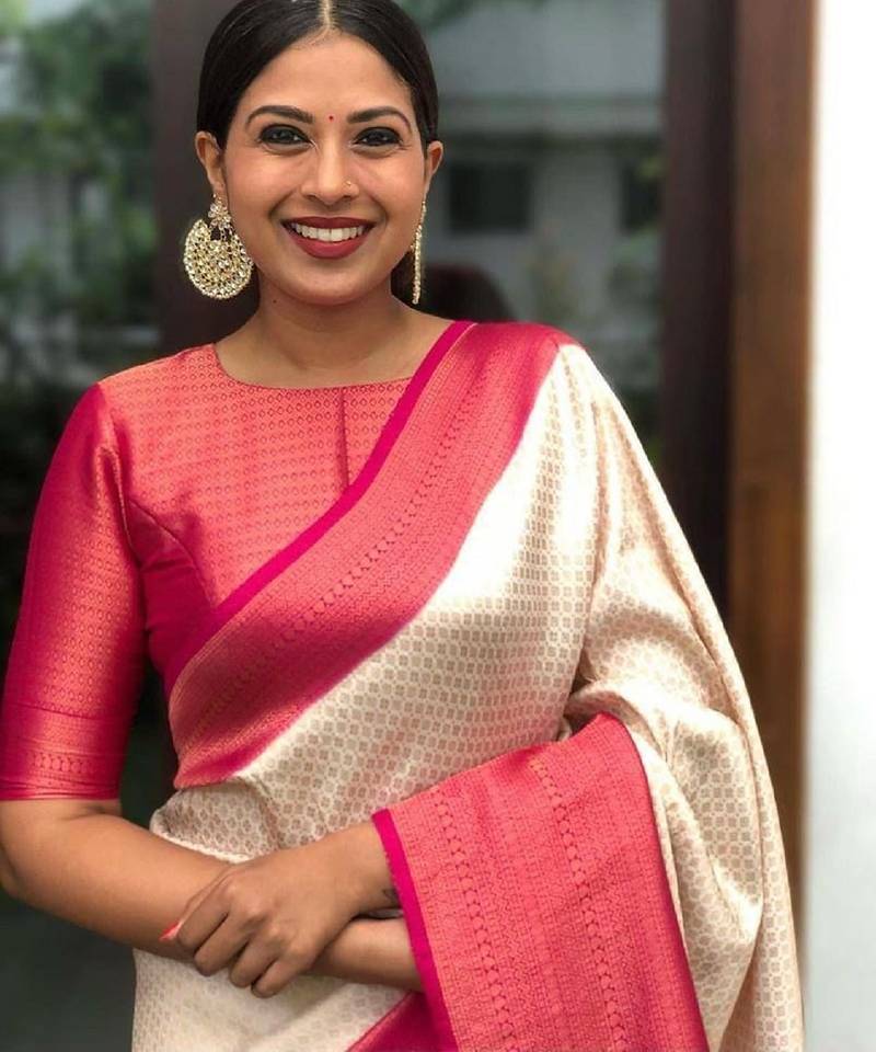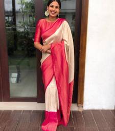 Off white pink soft silk blend banarasi jacuard work designer party wear saree with unstitched blouse piece