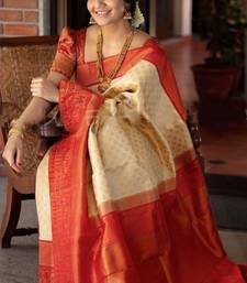 Off white red soft silk blend banarasi jacuard work designer party wear saree with unstitched blouse piece