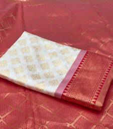 Off white red soft silk blend banarasi jacuard work designer party wear saree with unstitched blouse piece