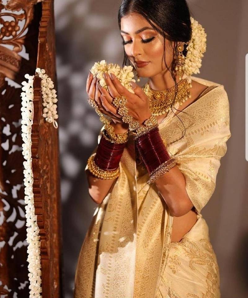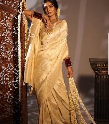 Off white soft silk blend banarasi jacuard work designer party wear saree with unstitched blouse piece