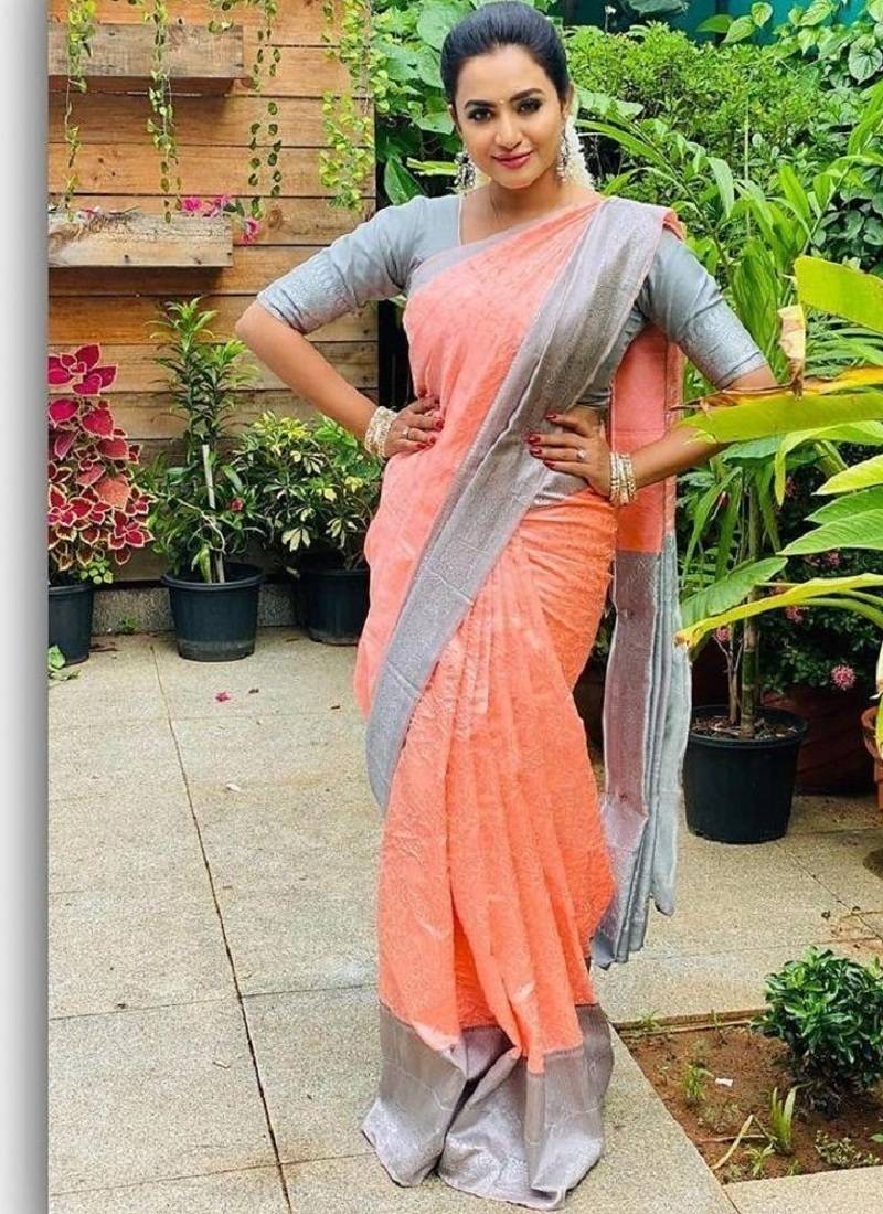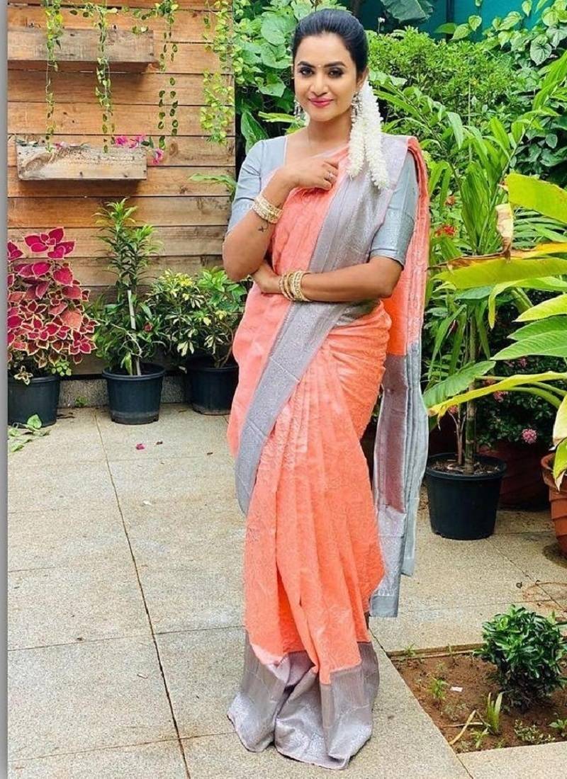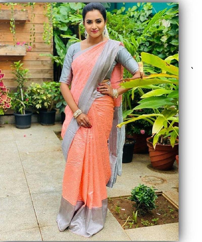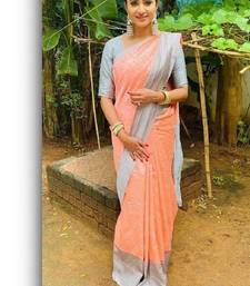 | • | Saree | : | Color- Peach / Fabric- Silk Blend |