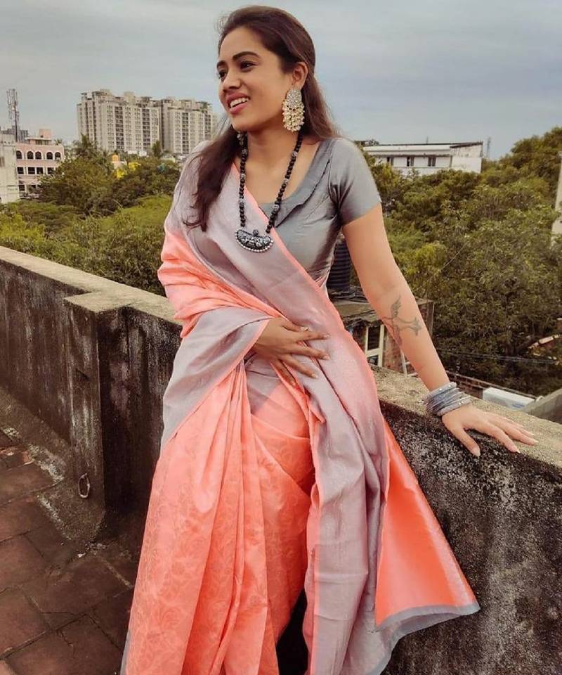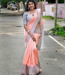 Peach grey soft silk blend banarasi jacuard work designer party wear saree with unstitched blouse piece