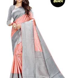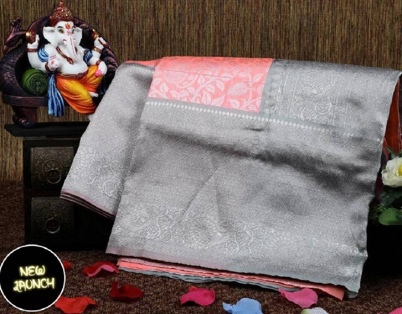 Peach grey soft silk blend banarasi jacuard work designer party wear saree with unstitched blouse piece