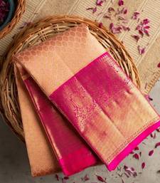 Design Details The Saree Features A Soft Peach Base Adorned With Delicate Woven Motifs That Enhance Its Royal Charm. The Rich Wine Colored Border And Pallu Are Intricately Designed With Traditional Banarasi Zari Weaving, Adding Depth, Contrast, And Grandeur To The Overall Look. The Ornate Zari Work Reflects Classic Heritage Craftsmanship, Making This Saree Ideal For Festive Occasions, Weddings, Cultural Events, And Celebrations. Blouse Details