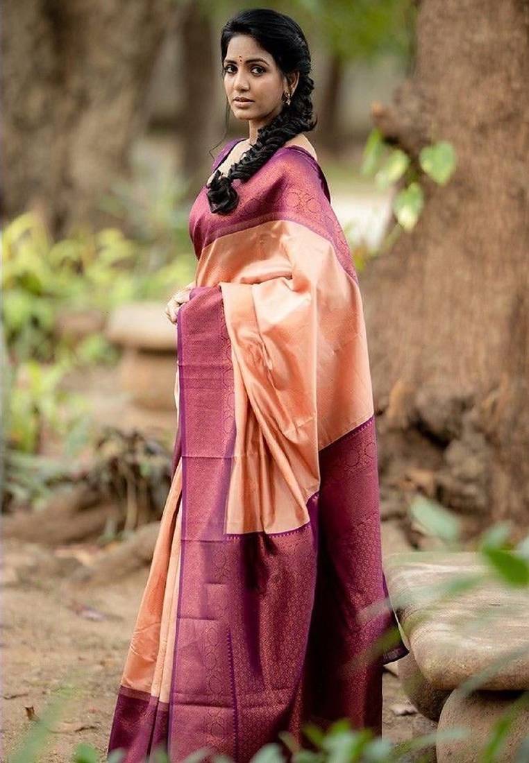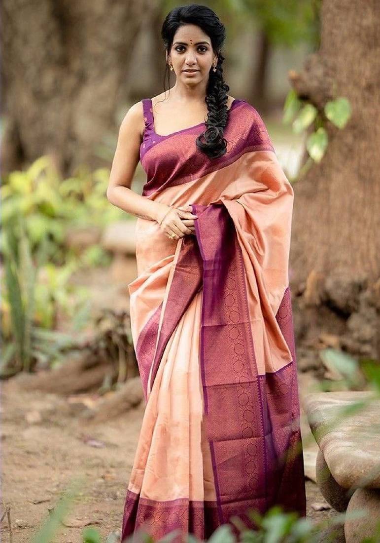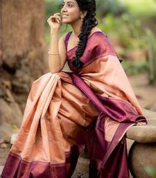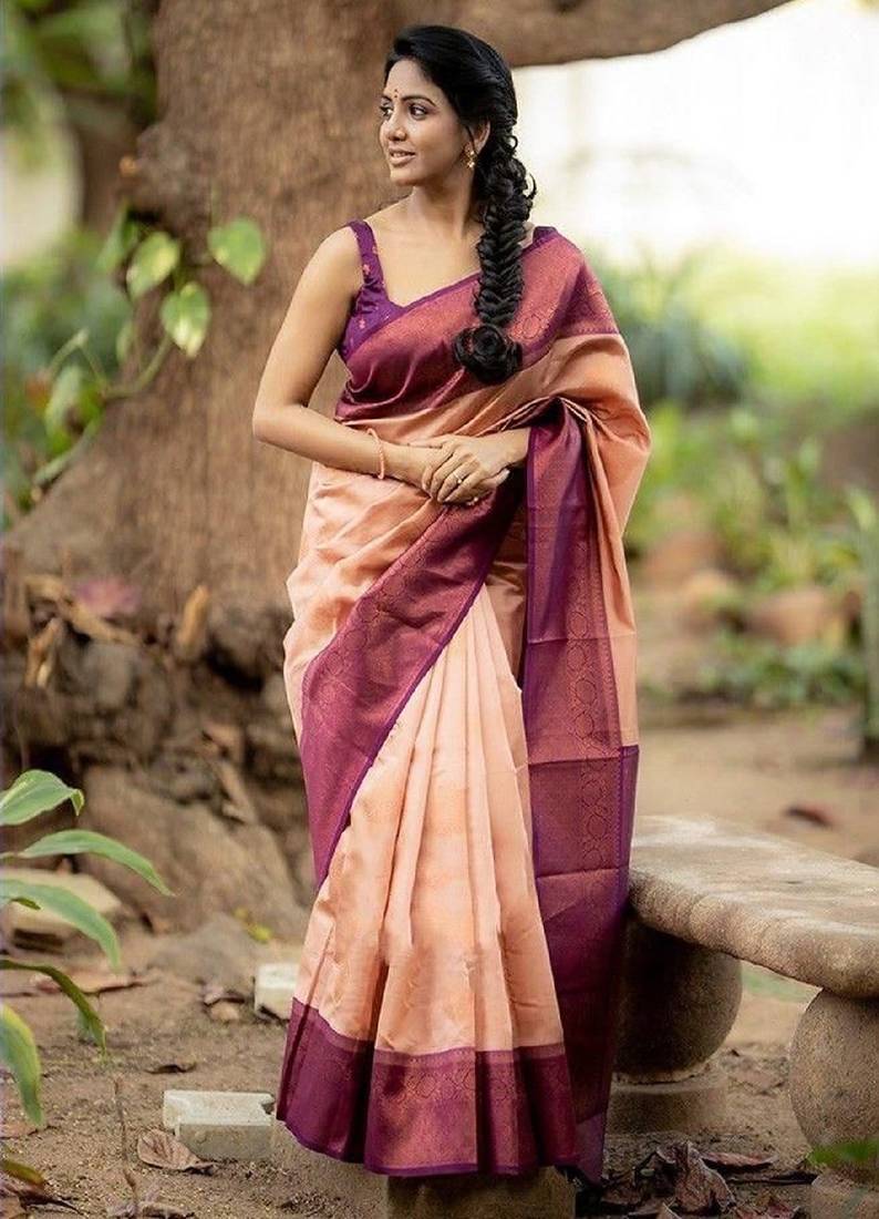 Peach wine soft silk blend banarasi jacuard work designer party wear saree with unstitched blouse piece