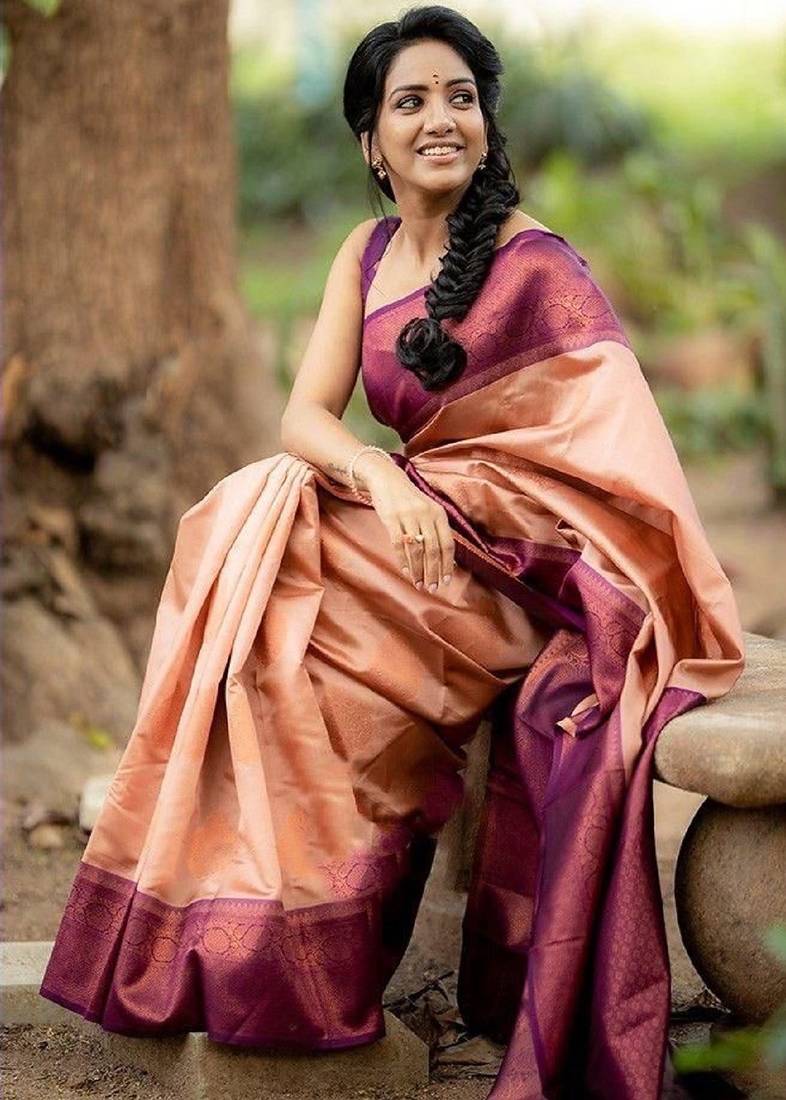 | • | Saree | : | Color- Peach / Fabric- Silk Blend |