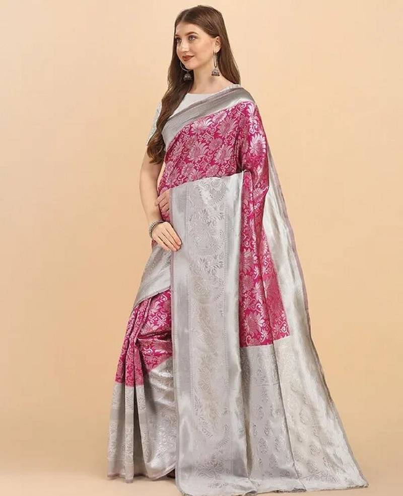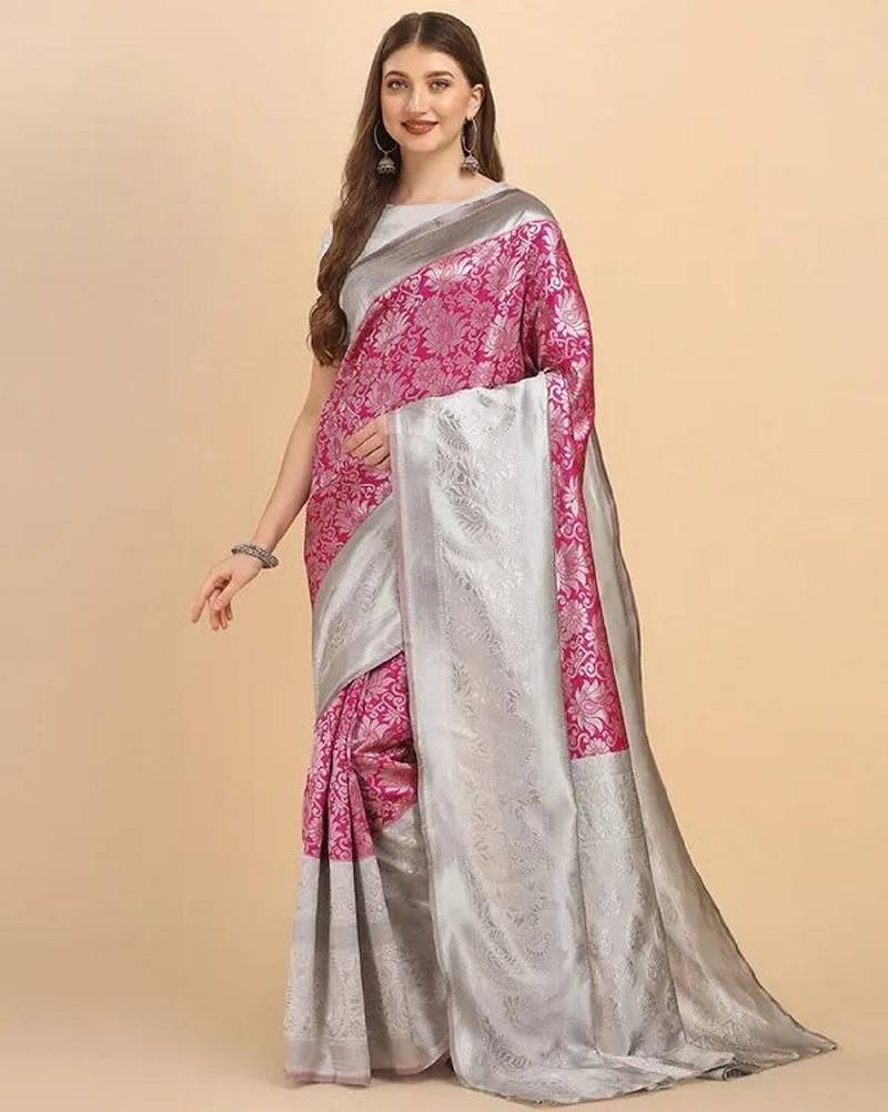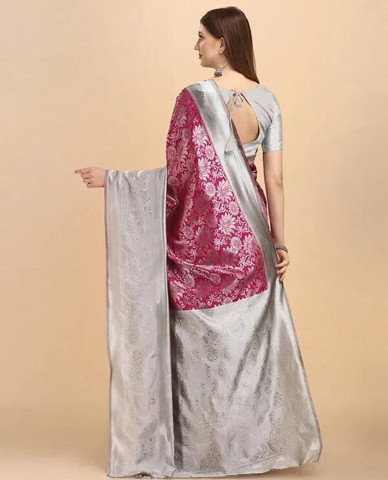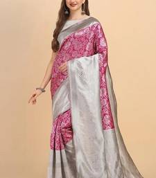Pink grey soft silk blend banarasi jacuard work designer party wear saree with unstitched blouse piece