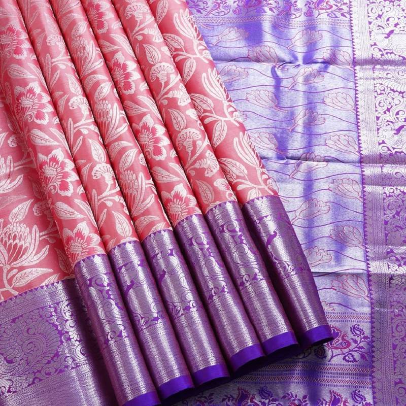 Design Details The Saree Features A Soft Peach Base Adorned With Delicate Woven Motifs That Enhance Its Royal Charm. The Rich Wine Colored Border And Pallu Are Intricately Designed With Traditional Banarasi Zari Weaving, Adding Depth, Contrast, And Grandeur To The Overall Look. The Ornate Zari Work Reflects Classic Heritage Craftsmanship, Making This Saree Ideal For Festive Occasions, Weddings, Cultural Events, And Celebrations. Blouse Details