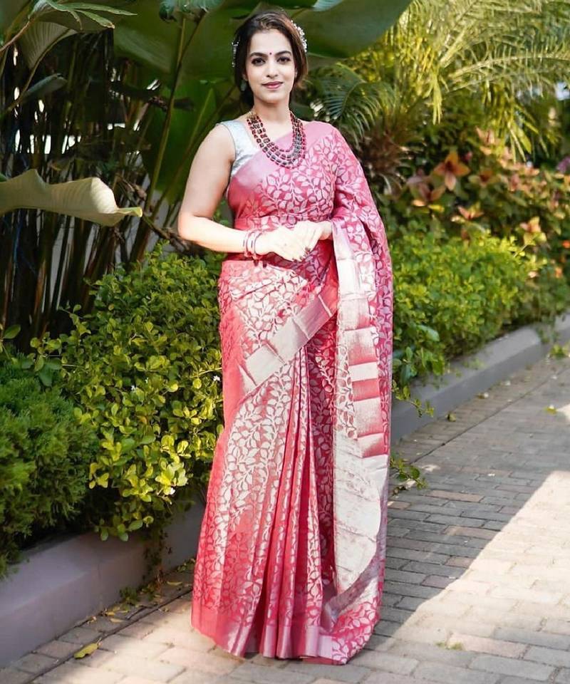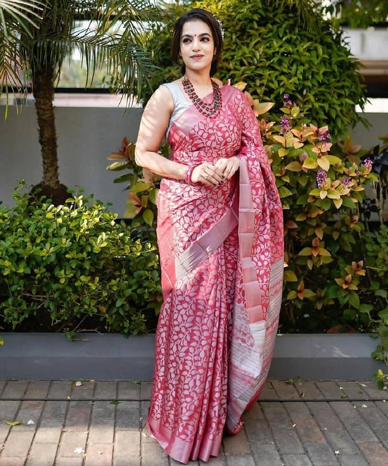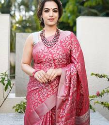 Pink soft silk blend banarasi jacuard work designer party wear saree with unstitched blouse piece