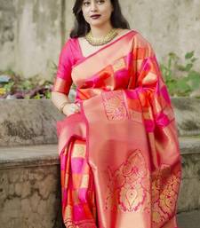 Pink soft silk blend banarasi jacuard work designer party wear saree with unstitched blouse piece
