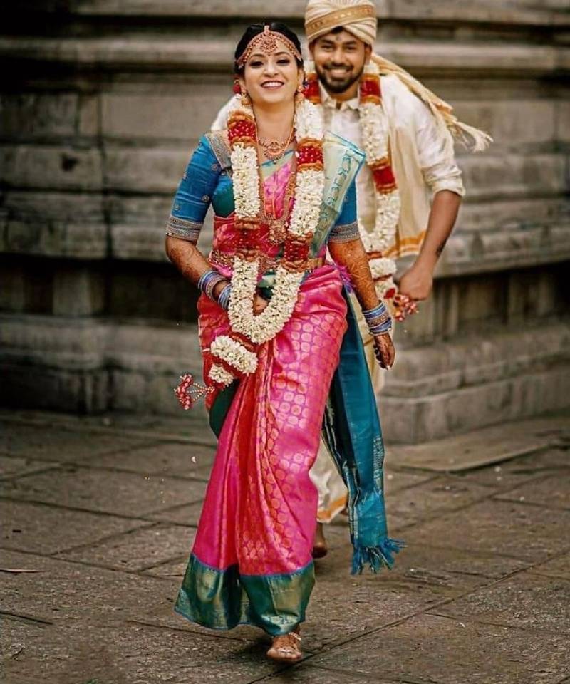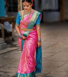 Pink turqoise soft silk blend banarasi jacuard work designer party wear saree with unstitched blouse piece
