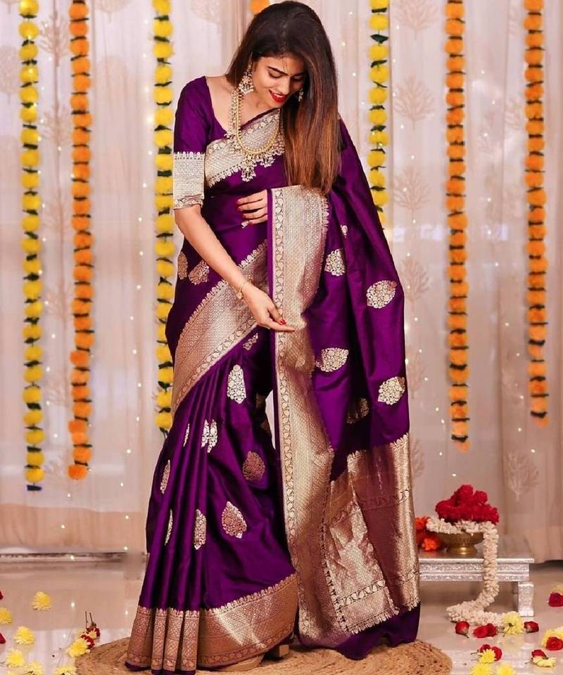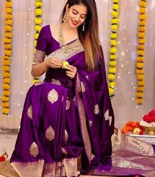 Purple soft silk blend banarasi jacuard work designer party wear saree with unstitched blouse piece