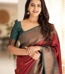 Red green soft silk blend banarasi jacuard work designer party wear saree with unstitched blouse piece