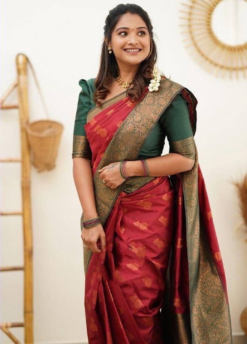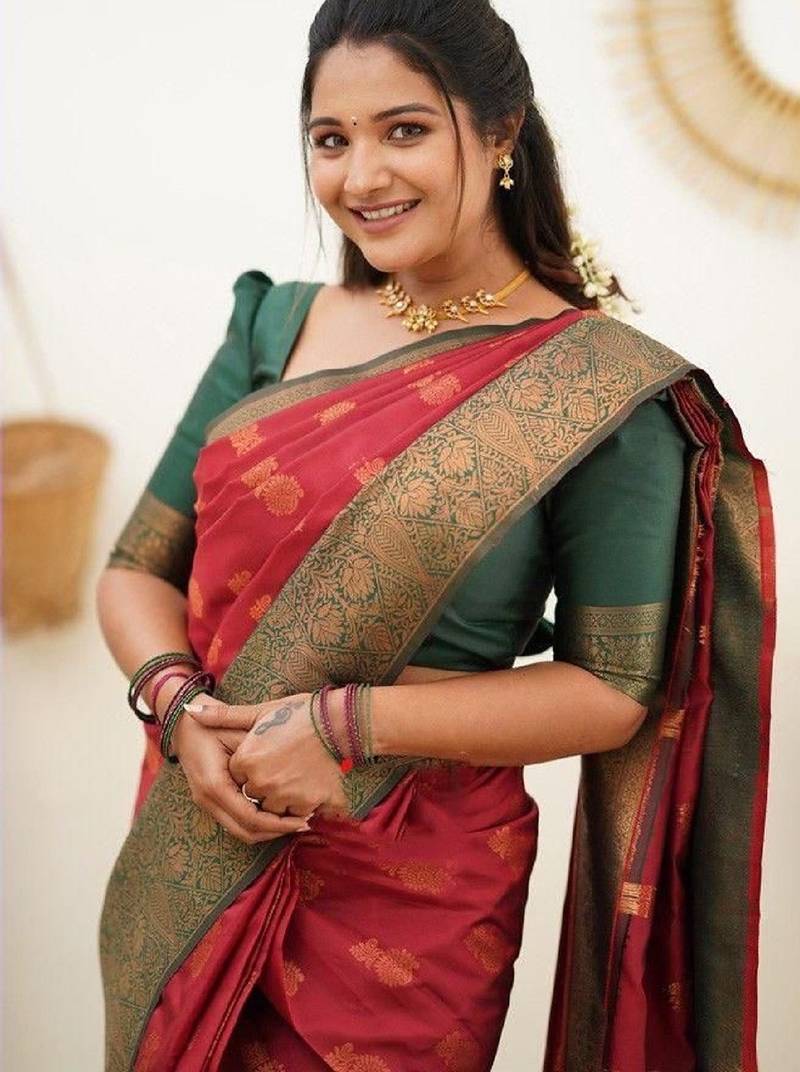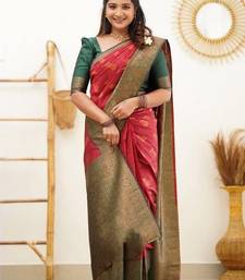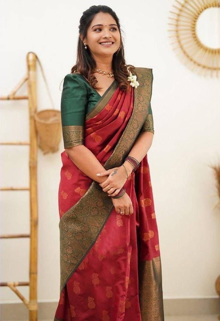 Red green soft silk blend banarasi jacuard work designer party wear saree with unstitched blouse piece