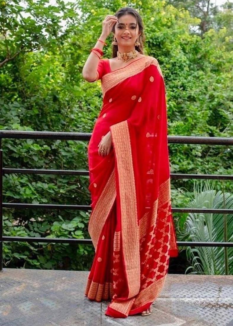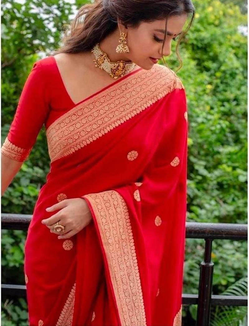 Red soft silk blend banarasi jacuard work designer party wear saree with unstitched blouse piece