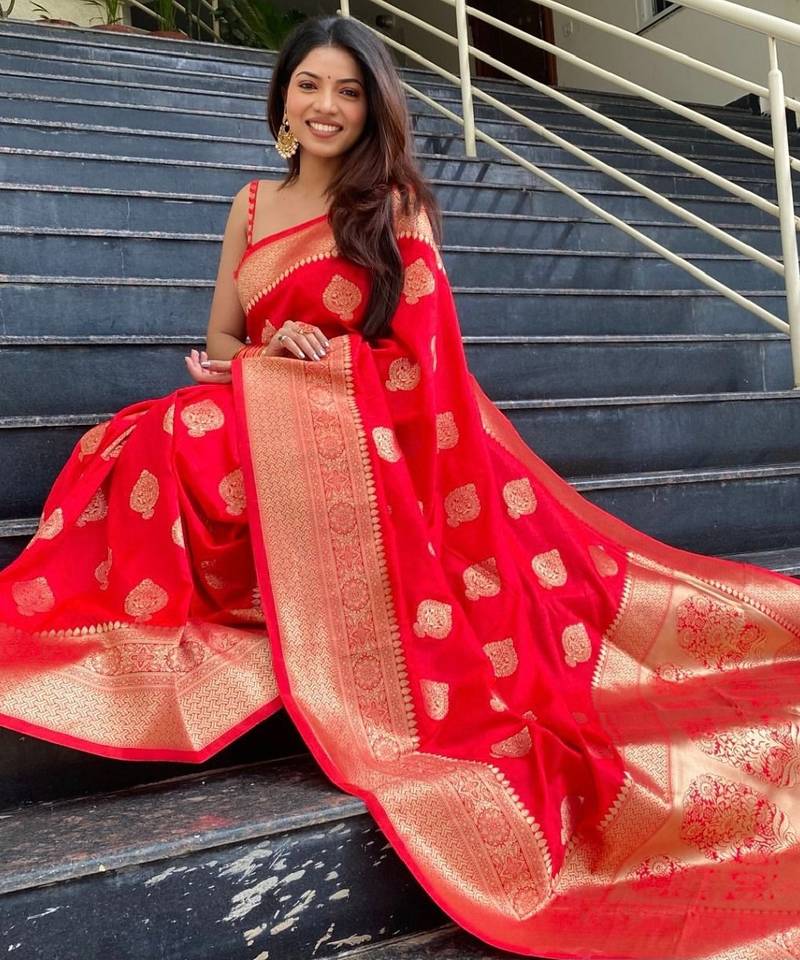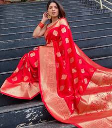 Red soft silk blend banarasi jacuard work designer party wear saree with unstitched blouse piece