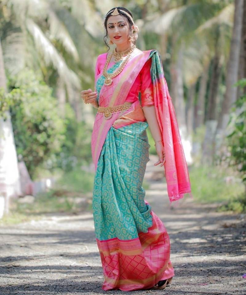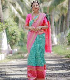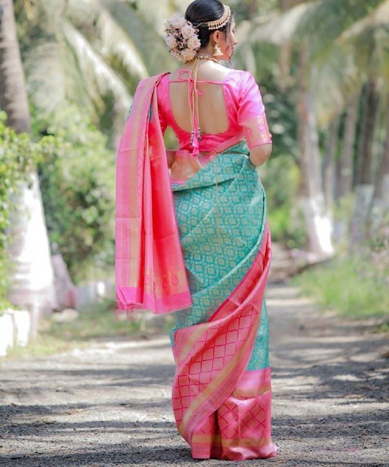 Sky blue pink soft silk blend banarasi jacuard work designer party wear saree with unstitched blouse piece