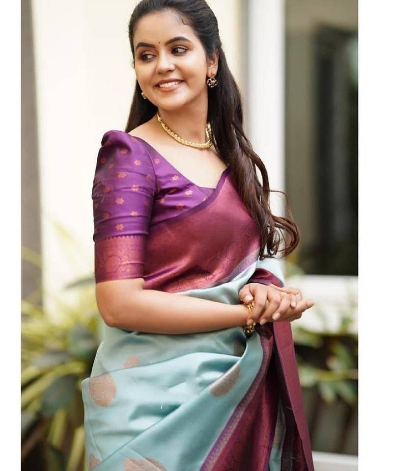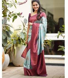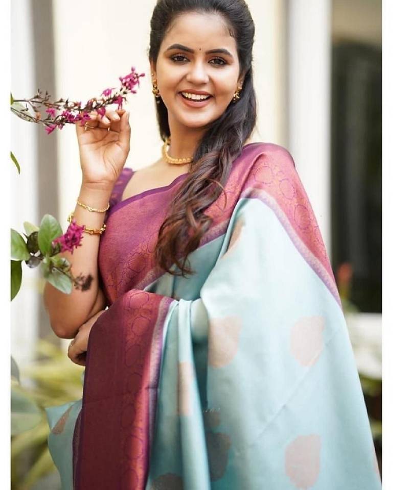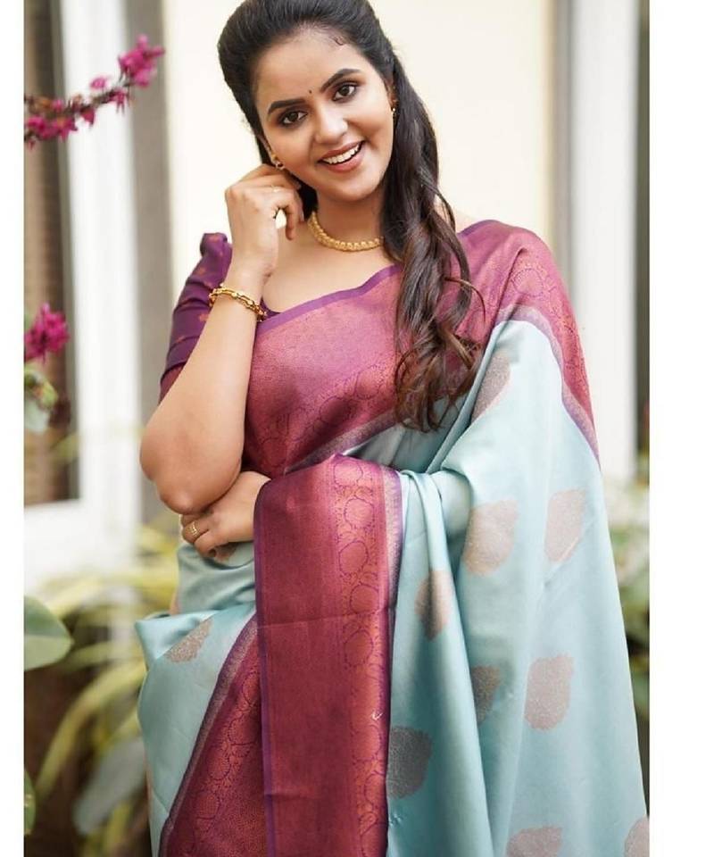 Sky blue purple soft silk blend banarasi jacuard work designer party wear saree with unstitched blouse piece