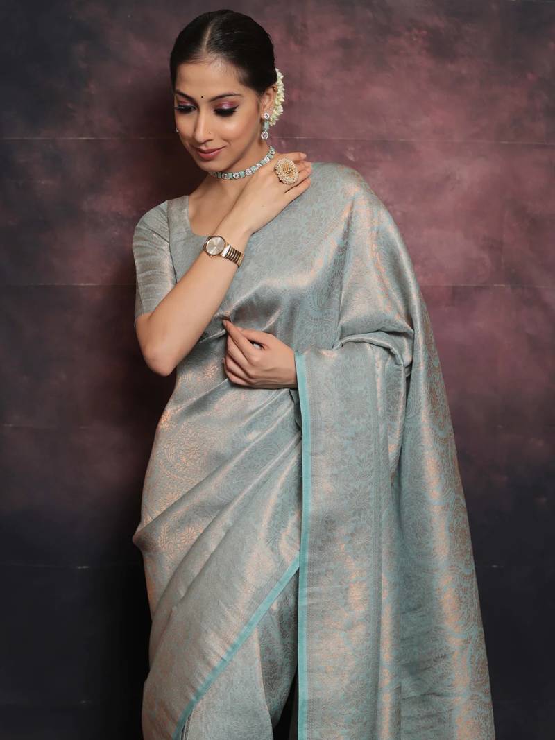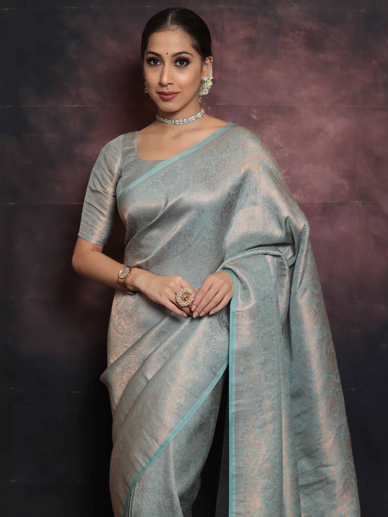 Sky blue soft art silk banarasi jacuard work designer party wear saree with unstitched blouse piece
