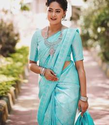Sky blue soft silk blend banarasi jacuard work designer party wear saree with unstitched blouse piece