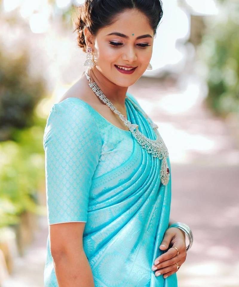 | • | Saree | : | Color- Sky Blue / Fabric- Silk Blend |