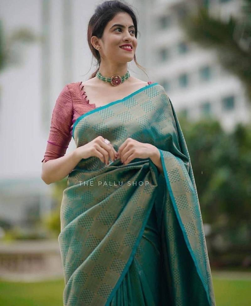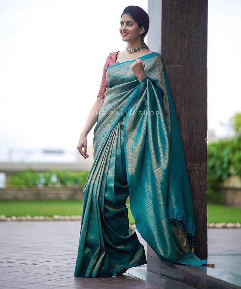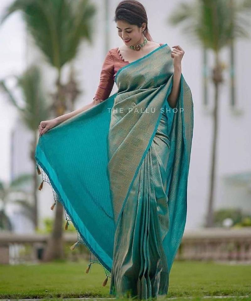 Sky blue soft silk blend banarasi jacuard work designer party wear saree with unstitched blouse piece