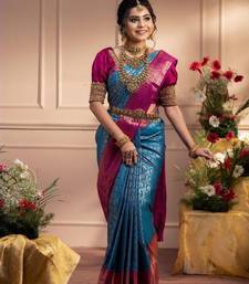 Turquoise pink soft silk blend banarasi jacuard work designer party wear saree with unstitched blouse piece