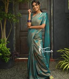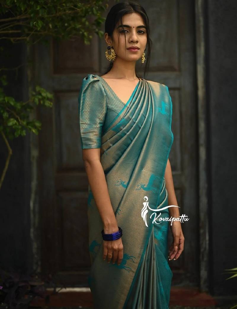 Turquoise soft silk blend banarasi jacuard work designer party wear saree with unstitched blouse piece