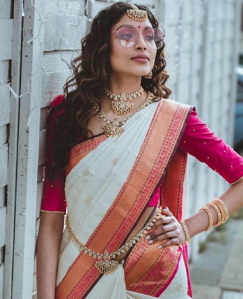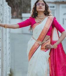 White pink soft silk blend banarasi jacuard work designer party wear saree with unstitched blouse piece