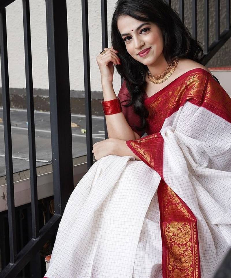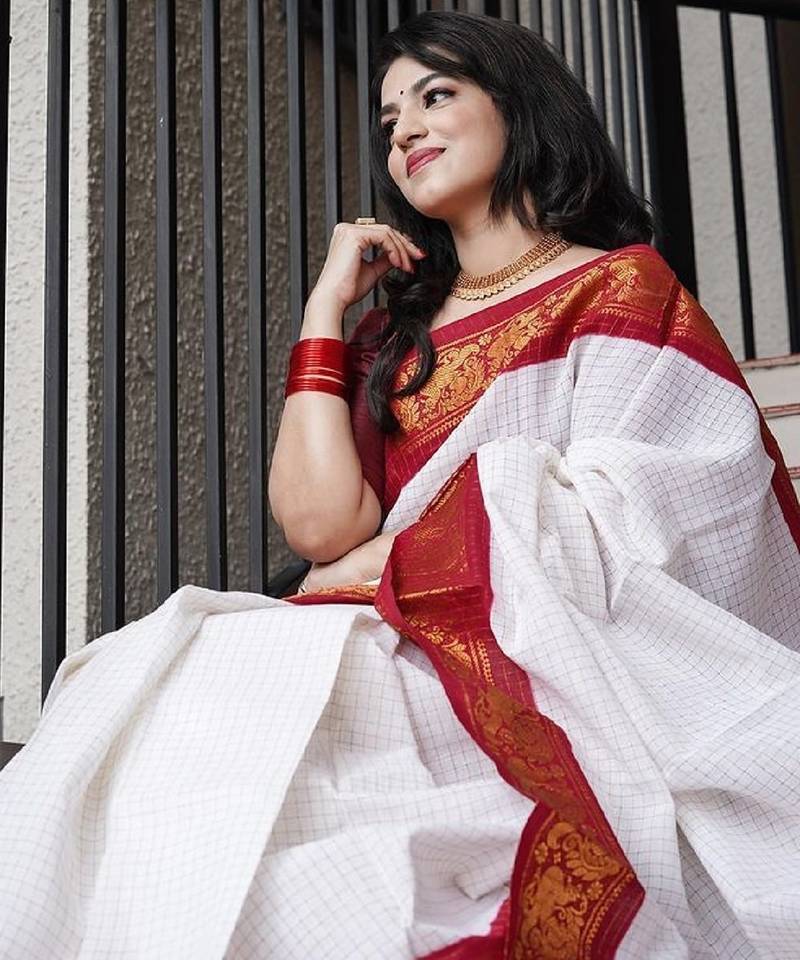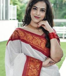 White red soft silk blend banarasi jacuard work designer party wear saree with unstitched blouse piece