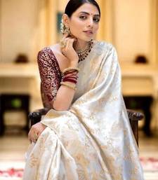 White soft silk blend banarasi jacuard work designer party wear saree with unstitched blouse piece