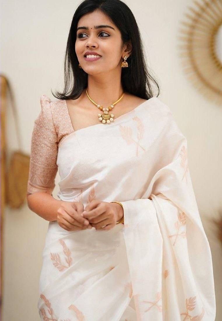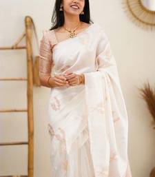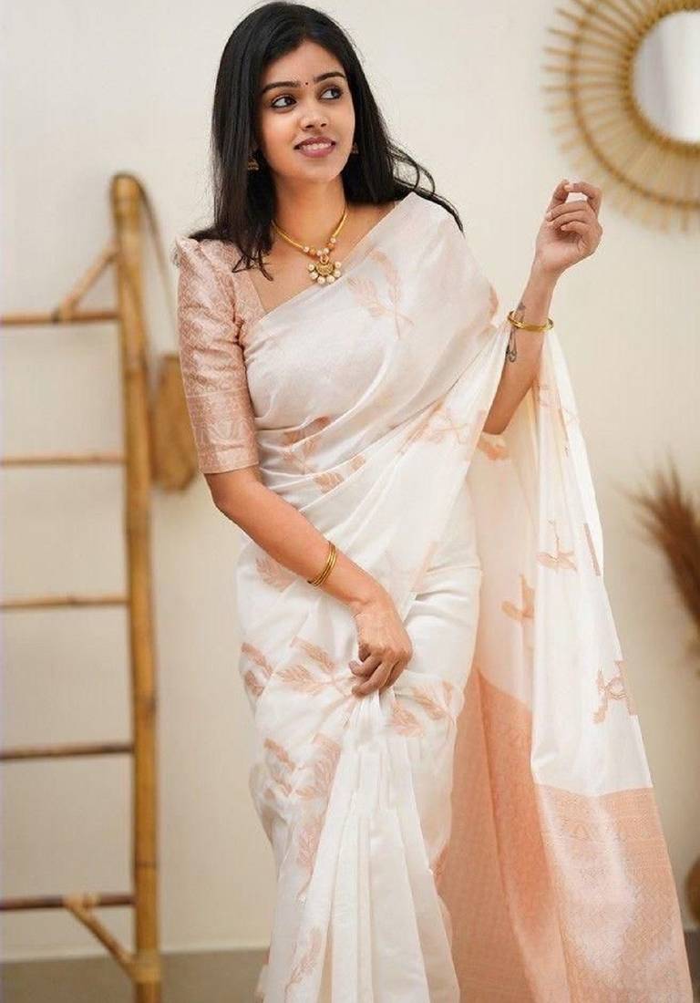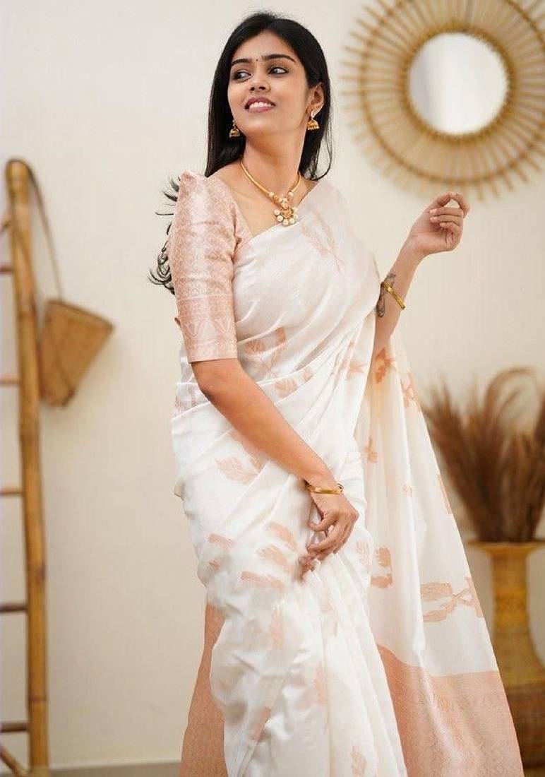 White soft silk blend banarasi jacuard work designer party wear saree with unstitched blouse piece