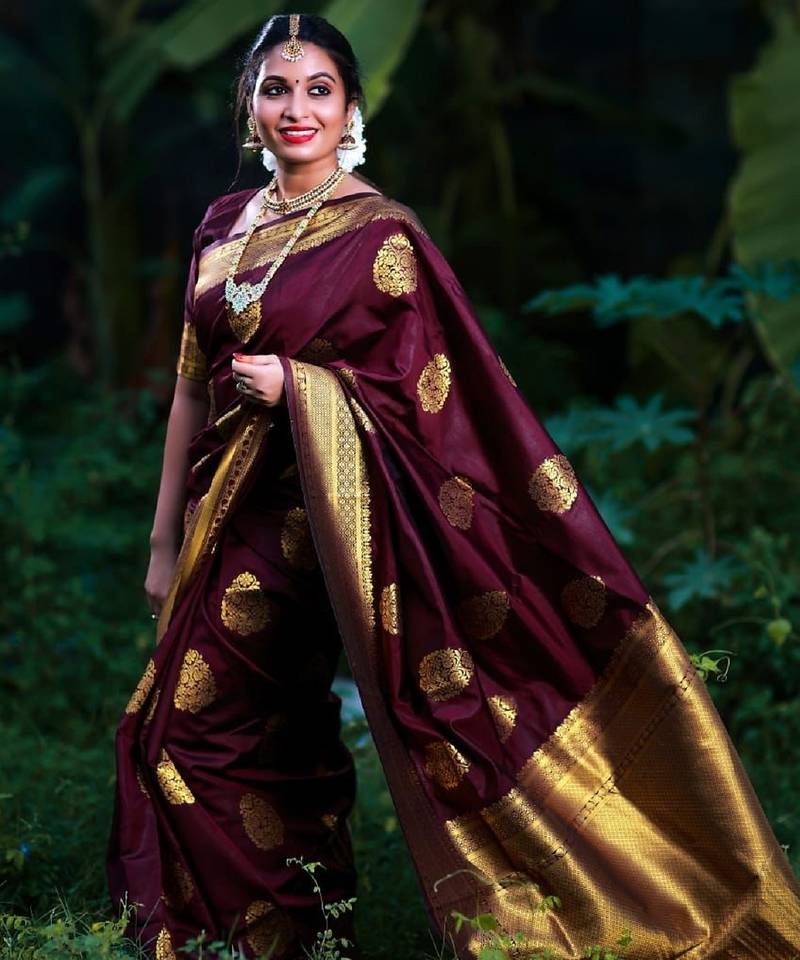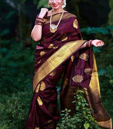 Wine soft silk blend banarasi jacuard work designer party wear saree with unstitched blouse piece