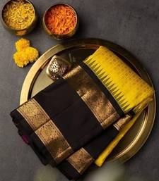 Yellow black soft silk blend banarasi jacuard work designer party wear saree with unstitched blouse piece