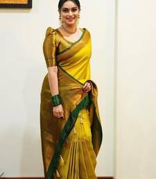 Yellow green soft silk blend banarasi jacuard work designer party wear saree with unstitched blouse piece