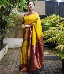 Yellow maroon soft silk blend banarasi jacuard work designer party wear saree with unstitched blouse piece