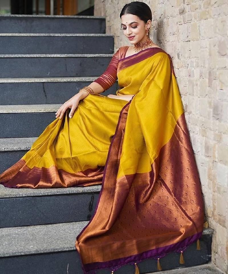 | Product Name | Yellow Maroon Soft Silk Blend Banarasi Jacuard Work Designer Party Wear Saree With Unstitched Blouse Piece | |