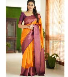Yellow purple soft silk blend banarasi jacuard work designer party wear saree with unstitched blouse piece