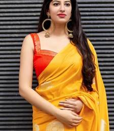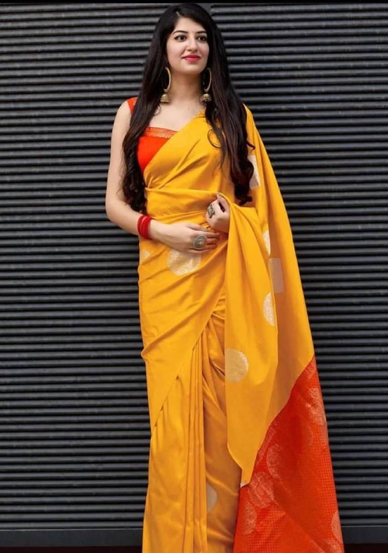 Yellow red soft silk blend banarasi jacuard work designer party wear saree with unstitched blouse piece