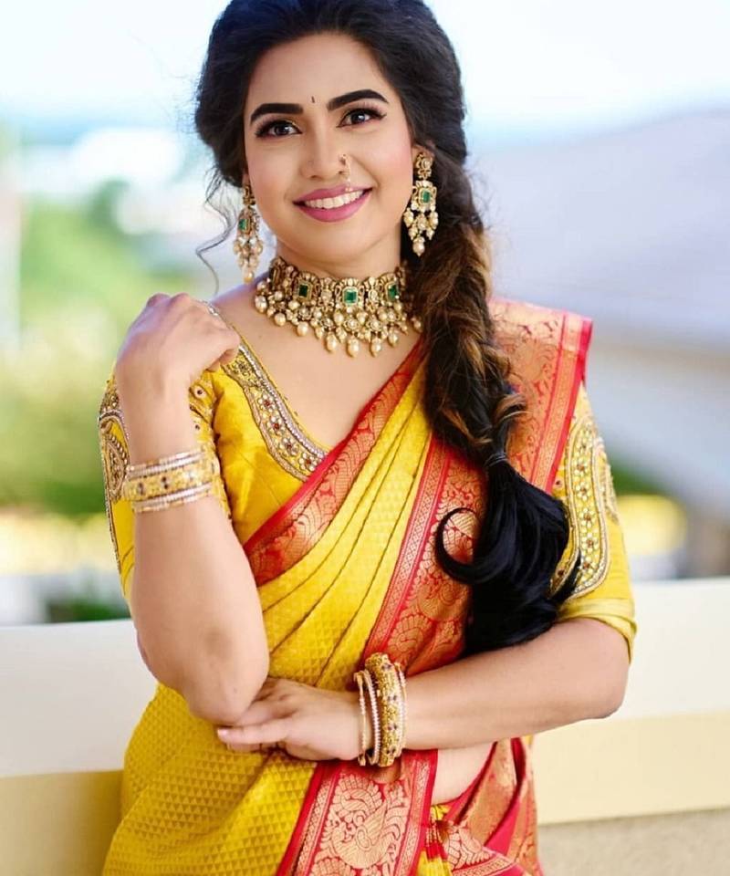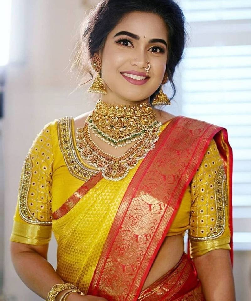 | • | Blouse | : | Color- Dark Yellow / Fabric- Banarasi Silk |