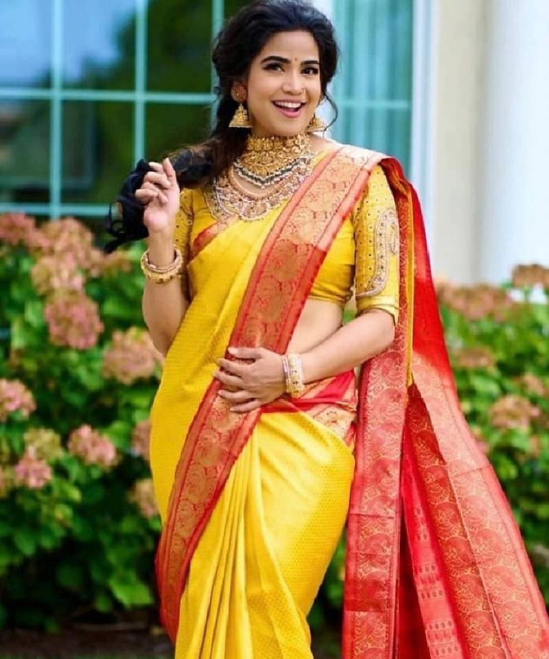 Yellow red soft silk blend banarasi jacuard work designer party wear saree with unstitched blouse piece