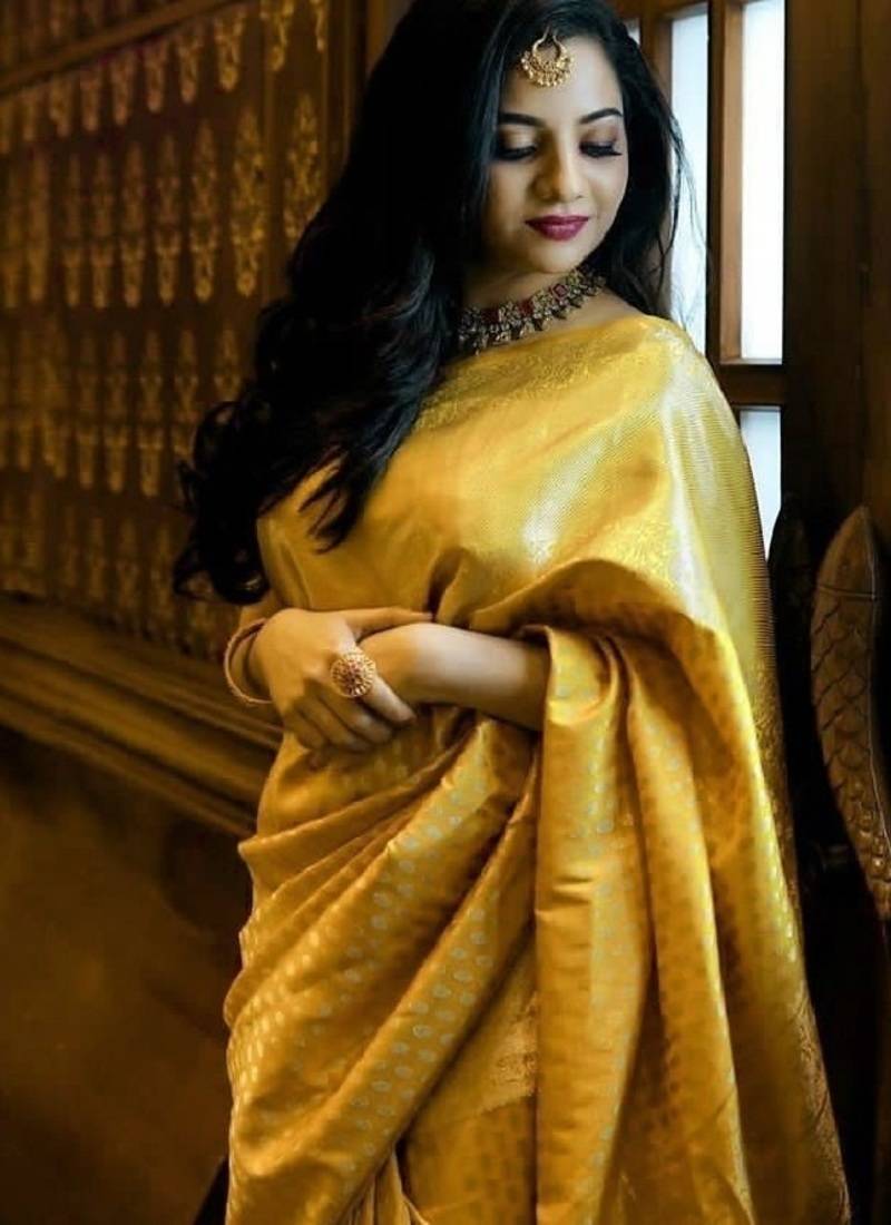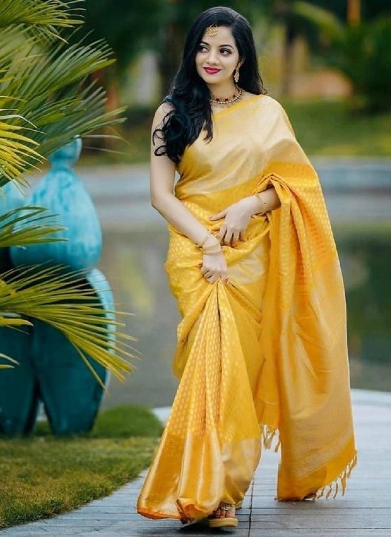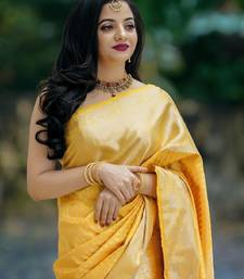 Yellow soft silk blend banarasi jacuard work designer party wear saree with unstitched blouse piece