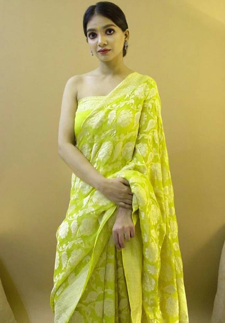 Yellow soft silk blend banarasi jacuard work designer party wear saree with unstitched blouse piece